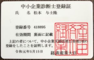 昨日、中小企業診断士登録証が届きました。5月21日の開業日に間に合った。これまでは中小企業診断士となり、開業することが目標であった。しかし、今はスタート地点に立っているだけ。このホームページに書いたことは、私の考えるビジネスモデル「仮説」に過ぎない。行動と経験により常に見直し、ブラッシュアップすることを心掛ける必要がある。