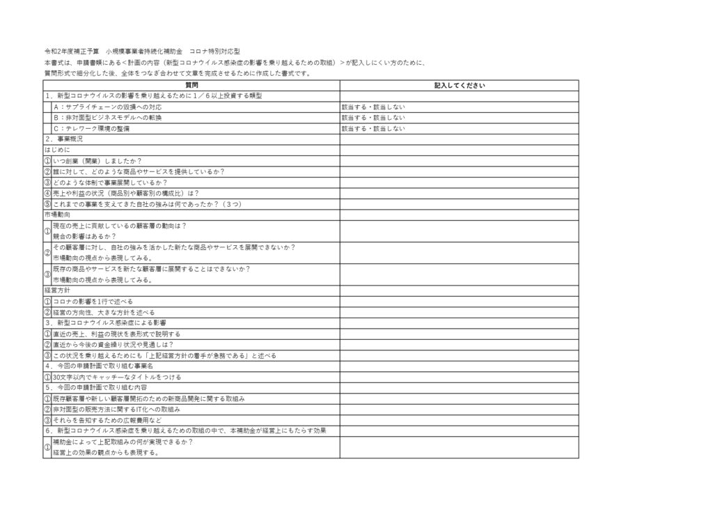 小規模事業者持続化補助金(コロナ特別対応型)申請書の経営計画書が書きにくい方のために