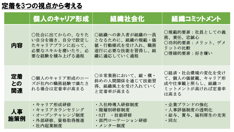 「定着」という言葉は、組織側の言葉です。組織に合った個人を採用し、持続的にパフォーマンスを発揮してもらう。そのために様々な人事施策を採って行きます。