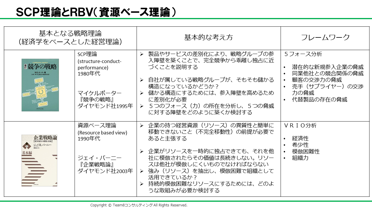 下の表はSCP理論とRBVの基本的な考え方とその理論から導き出されたフレームワークを整理したものです。