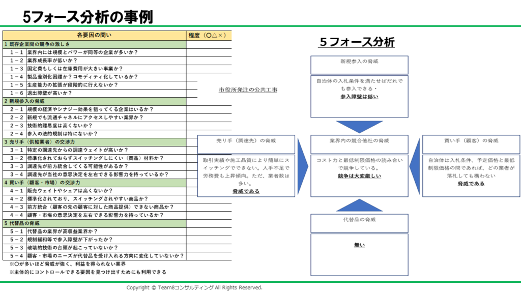 そして、地方自治体の公共工事の請負事業者を例にして5フォース分析を行った場合、どのような結果になるかも掲載したので参考にしてください。